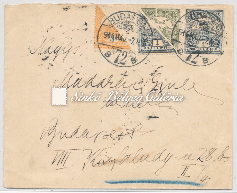 Description | 1914.05.07. Helyi levél BUDAPESTen. 1f Turul + felezett 1f, 3f, 6f bélyegekkel bérmentesítve. / 1914.05.07. Local letter in BUDAPEST. Franked with 1f Turul stamp + halved 1f, 3f, 6f stamps. |