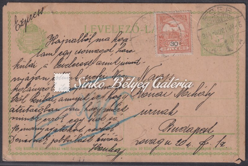 Description | 1914.11.14. Expressz levél EGER-BUDAPEST között. 5f díjjegyes Levelző-lap 1913. Turul 30f bélyegkiegészítéssel bérmentesítve! / 1914.11.14. Express letter between EGER-BUDAPEST. 5f postal stationery Letter-sheet franked and supplied with 1913. Turul 30f stamp! |