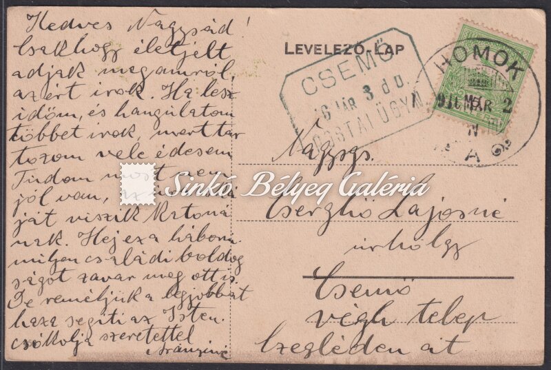 Leírás | 1916.03.02. Képeslap HOMOKról CSEMŐre küldve. CSEMŐ POSTAI ÜGYN. bélyegzővel! / 1916.03.02. Postcard sent from HOMOK to CSEMO. With CSEMO POSTAL AGNECY's cancellation! |