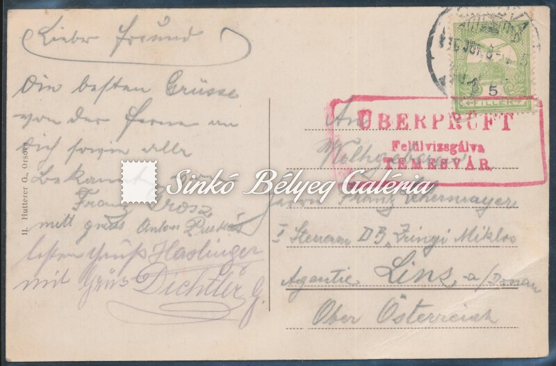Leírás | 1916.06.08. Orsovai képeslap 5f bélyeggel bérmentesítve, piros temesvári cenzúra bélyegzővel! / 1916.06.08. Orsova postcard franked with 5f stamp, with red coloured Temesvar censorsip stamping! |
