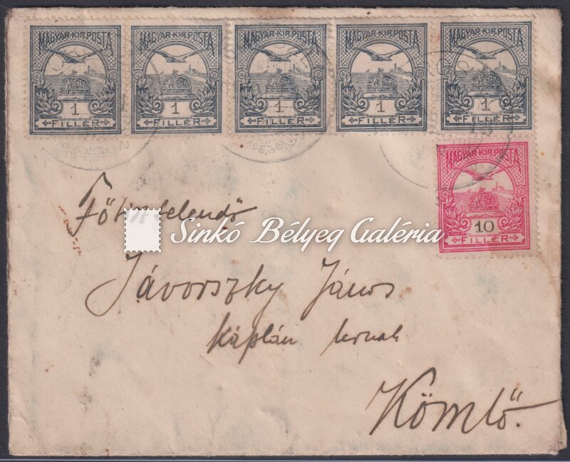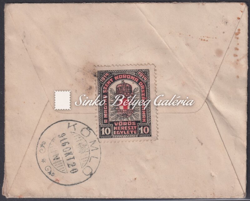 Leírás | 1916.10.18. Távolsági levél POROSZLÓ-KÖMLŐ között. 5x1f + 10f Turul bélyegekkel bérmentesítve! A Vöröskereszt Egylet levélzárójával! / 1916.10.18. Long distance letter between POROSZLO-KOMLO. Franked with 5x1f +10f Turul stamps! With the cinderella of the Red Cross Association! |