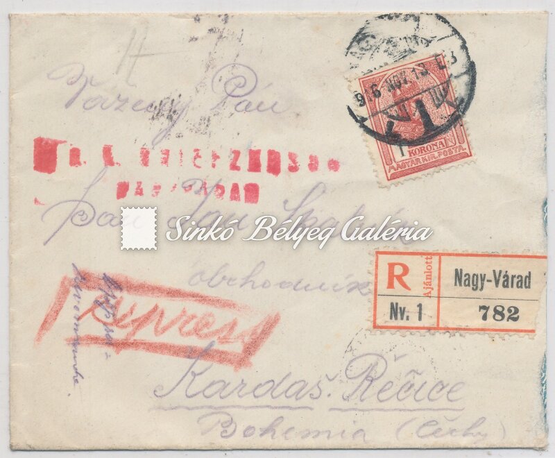 1916.11.13. Expressz ajánlott távolsági levél NAGY-VÁRAD - KARDAS RECICE