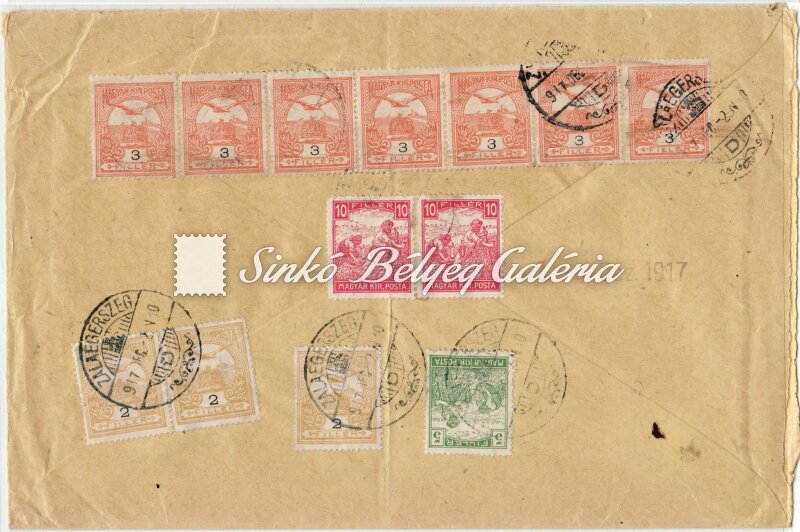 Leírás | 1917.12.02. Ajánlott távolsági levél ZALAEGERSZEG-WIEN között. 1913-as 7x3f + 3x2f Turul, 2x10f Fehérszámú Arató és 5f Arató bélyegekkel vegyesen bérmentesítve. / 1917.12.02. Registered long distance letter between ZALAEGERSZEG-WIEN. Mixed franking with 7x 3f + 3x2f Turul stamps from 1913, 2x10f White number Harvester and 5f Harvester stamps. |