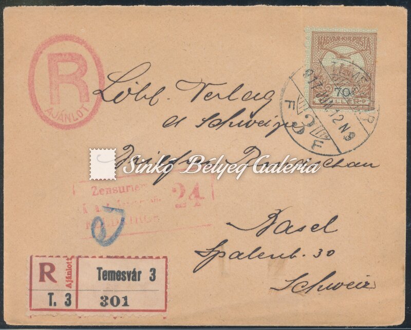 1917.06.12. Ajánlott távolsági levél TEMESVÁR-BASEL
