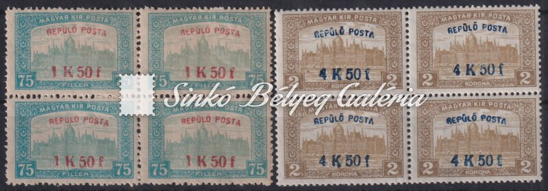 Leírás | 1918. Repülő Posta - L 4-es tömb sor, bepattant fogak! / 1918. Flying Post - L Block of 4 set, faulty perforation! |