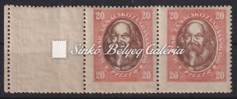 Leírás | 1919. Magyar Tanácsköztársasági Arcképek Álló vízjeles 20f bélyegpár bal oldali üres mezővel! Katalógus érték: 50.000 HUF / 1919. Portraits of the Hungarian Soviet Republic 20f stamp pair with standing watermark and with a blank field on the left! Catalogue value: 50.000 HUF |