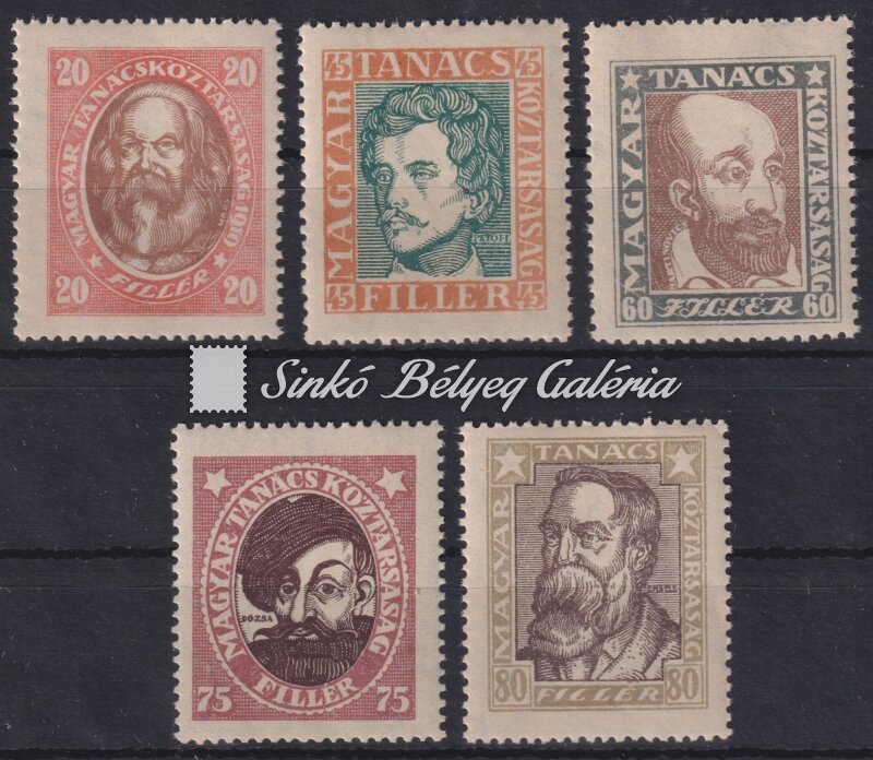 Leírás | 1919. Magyar Tanácsköztársasági Arcképek A, álló vízjeles sorozat. Katalógus érték: 30.000 HUF / 1919. Portraits of the Hungarian Soviet Republic Set with A, standing watermark. Catalogue value: 30.000 HUF |