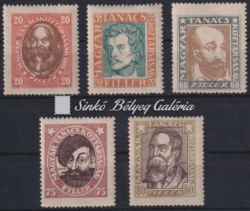Leírás | 1919. Magyar Tanácsköztársasági Arcképek A sor álló vízjellel. Katalógus érték: 30.000 HUF / 1919. Portraits of the Hungarian Soviet Republic A set with standing watermark. Catalogue value: 30.000 HUF |