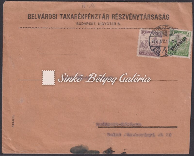 Leírás | 1919.04.16. Helyi perfin levél BUDAPESTen. 20f díjtétellel, a Belvárosi Takarékpénztár Rt. Céglyukasztásával ellátott 5f bélyeggel bérmentesítve! / 1919.04.16. Local perfin letter in BUDAPEST. With 20f fare, franked with a 5f stamp with the perfin punching of the Downtown Savings Bank Co.! |