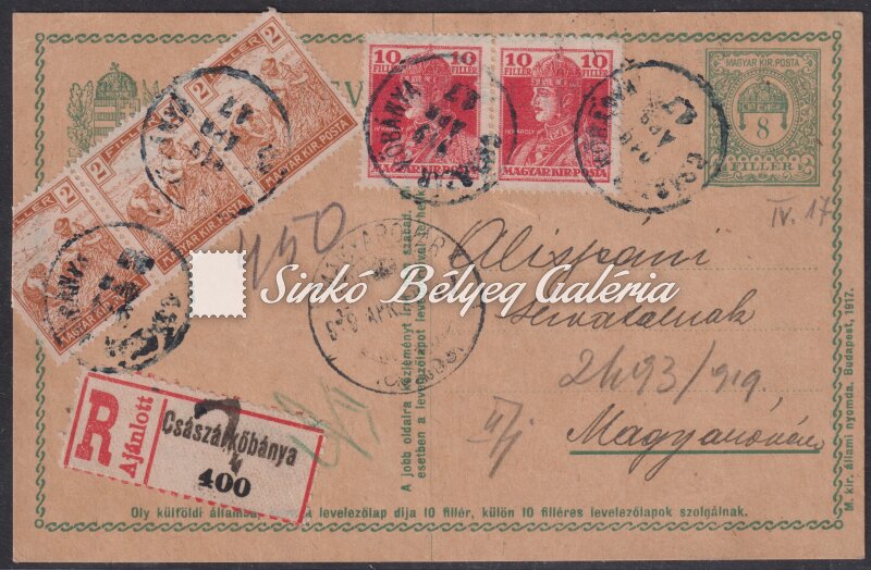 1919.04.17. Ajánlott távolsági levél CSÁSZÁRKŐBÁNYA-MAGYARÓVÁR