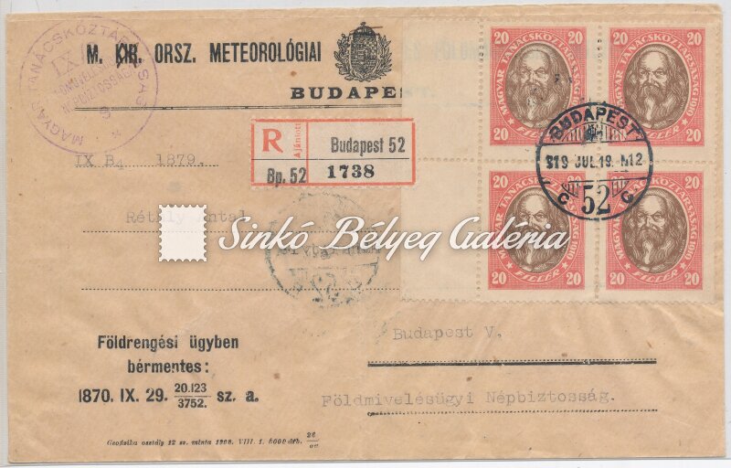 1919.07.19. Helyi ajánlott levél BUDAPEST