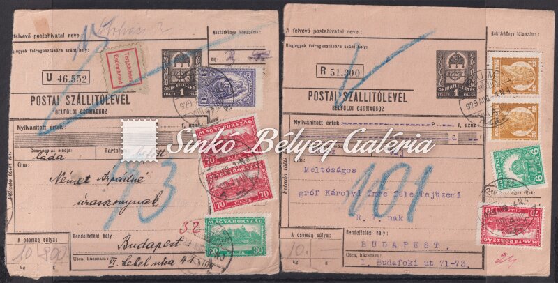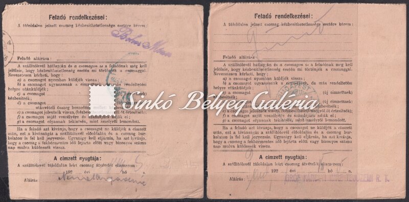 Leírás | 1929.08. Postai szállítólevelek belföldre, 2db 10kg feletti csomaggal! / 1929.08. Domestic postal delivery notes, 2 parcels weighing over 10 kg! |