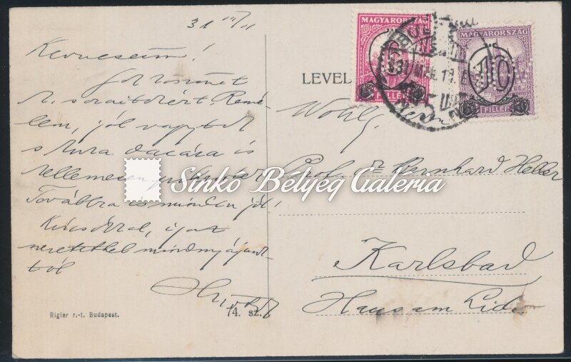 Leírás | 1931.03.19. Perfin levél BUDAPEST-KARLSBAD között. Magán levelezésű képeslap 2db Kisegítő bélyeggel, A.M. perfin lyukasztással ellátva bérmentesítve! / 1931.03.19. Perfin letter between BUDAPEST-KARLSBAD. Private postcard franked with 2 pieces of Auxiliary stamps, with A.M. perfin punching! |