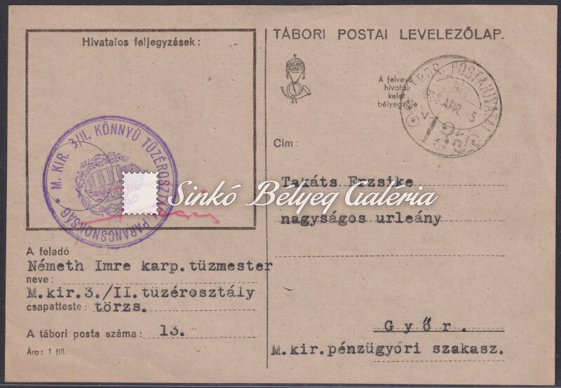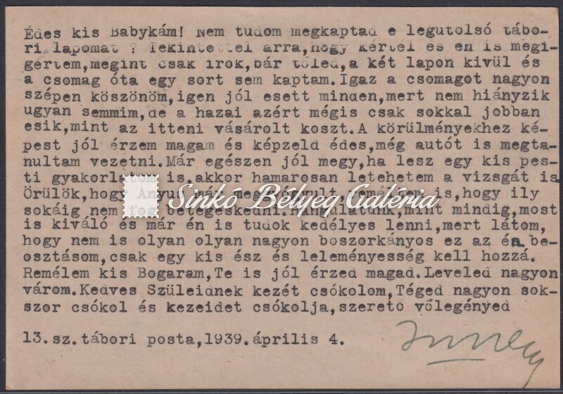 1939.04.05. Tábori Postai Levelezőlap GYŐRbe küldve