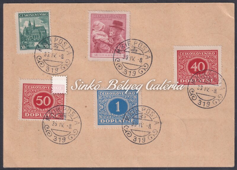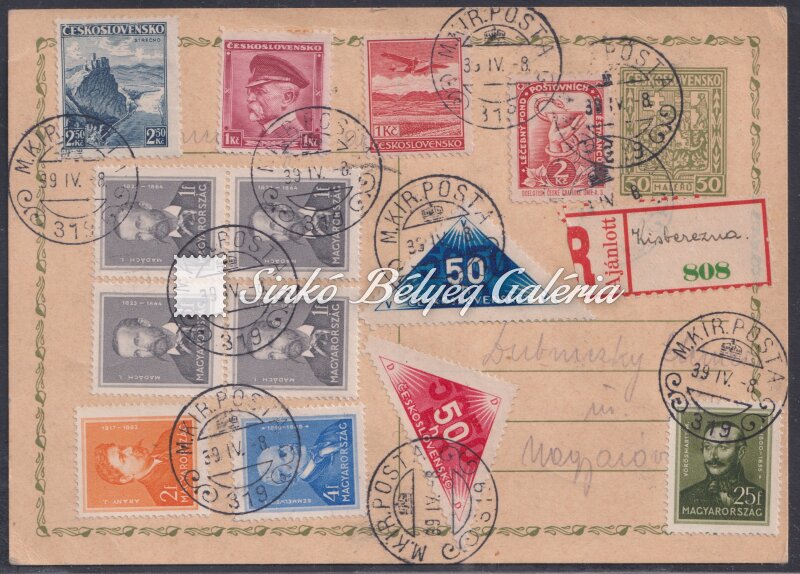 Leírás | 1939.04.08. Ajánlott levél KISBEREZNA-MAGYARÓVÁR között. M. KIR. POSTA/319 kisegítő bélyegzővel 50H Csehszlovák díjjegyesen! / 1939.04.08. Registered letter between KISBEREZNA-MAGYAROVAR. With H. ROY. POST/319 auxiliary cancellation on a 50H Czechoslovakian postal stationery! |