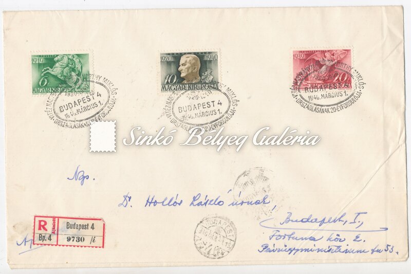1940. Kormányzói 20 éves évforduló sorozat helyi ajánlott levélen