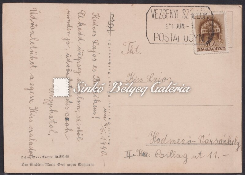 Leírás | 1940.06.09. Képeslap 10f bélyeggel feladva. VEZSENYI SZŐLLŐK POSTAI ÜGYN. bélyegzővel! / 1940.06.09. Postcard sent with a 10f stamp. With VEZSENYI SZOLLOK POSTAL AGENCY stamping! |