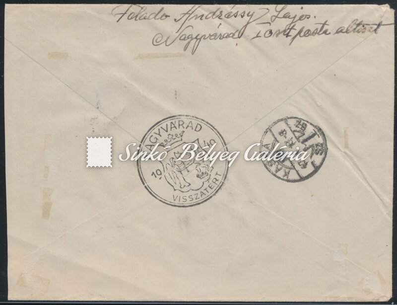 Leírás | 1940.10.11. Távolsági levél NAGYVÁRAD-KASSA között. 21f viteldíjjal bérmentesítve, Visszatért bélyegzéssel! / 1940.10.11. Long distance letter between NAGYVARAD-KASSA. Franked with 21f fare, with Returned cancellation! |