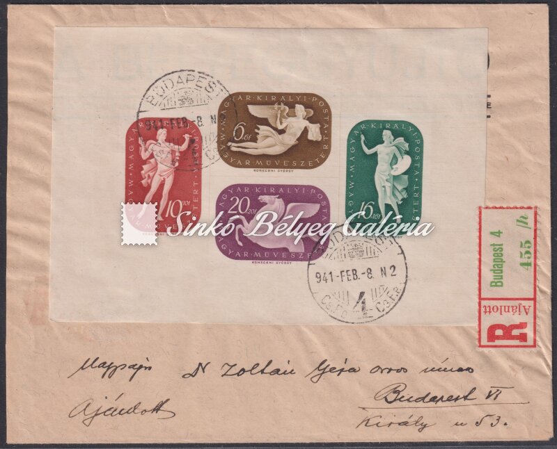 Leírás | 1941.02.08. Helyi ajánlott levél BUDAPESTen. A Művész - Blokkal bérmentesítve! Hátoldali érkező bélyegzővel! / 1941.02.08. Local registered letter in BUDAPEST. Franked with the Artist - Block. With arriving cancellation on the backside! |