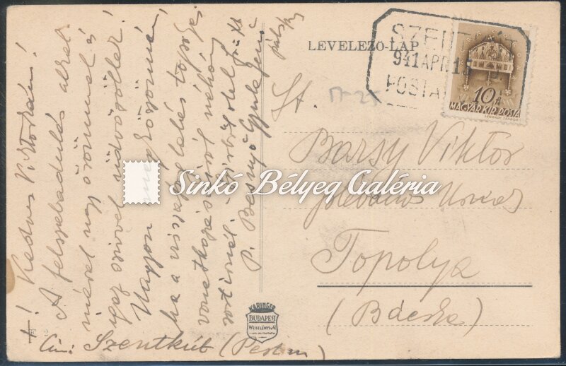 Leírás | 1941.04.15. Képeslap SZENTKÚT-TOPOLYA (SRB) között. SZENTKÚT POSTAI ÜGYN. bélyegzővel! / 1941.04.15. Postcard between SZENTKUT-TOPOLYA (SRB). With SZENTKUT POSTAL AGENCY cancellation! |