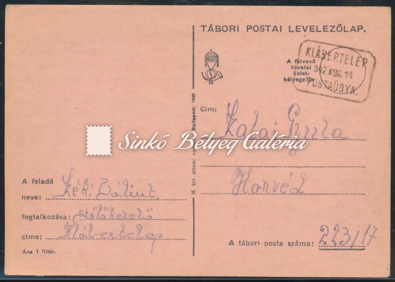 Description | 1942.08.11. Tábori Postai Levelezőlap KLÁBERTELEPről, POSTA ÜGYN. bélyegzővel! / 1942.08.11. Field Post postcard from KLABERTELEP, with POSTAL AGENCY cancellation! |