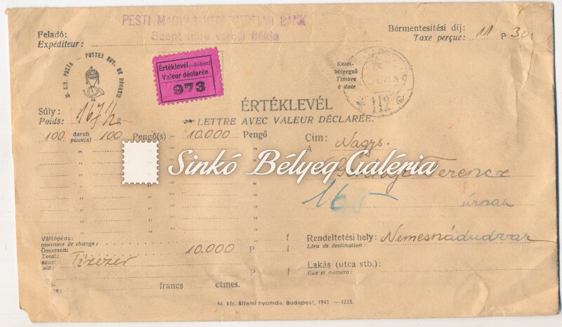 1943.11.26. Értéklevél BUDAPEST-NEMESNÁDUDVAR