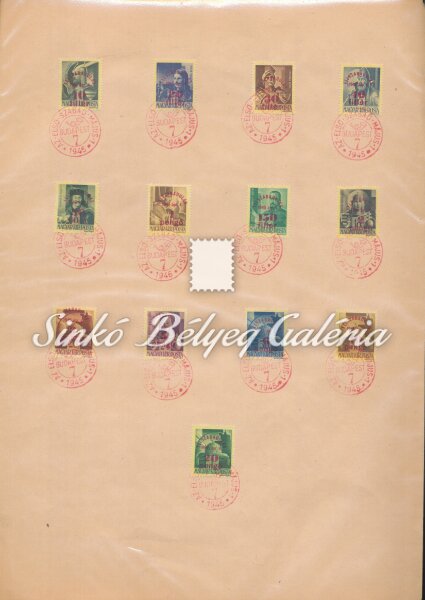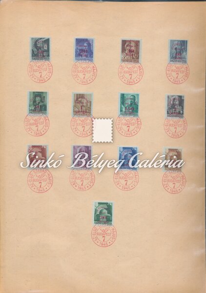 Leírás | 1945. Felszabadulás (I.) Teljes sor felragasztva piros színű elsőnapi alkalmi bélyegzővel "Az Első Szabad Május 1." / 1945. Liberation (I.) Complete set sticked on a paper, with red coloured first day occasional cancellation "The First Free 1th of May" |