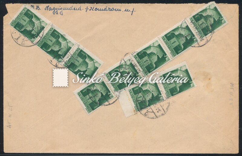 Leírás | 1945.09.25. 3. díjszabású távolsági levél NAGYINGMÁND-BUDAPEST között. 10x1P bélyegekkel bérmentesítve! / 1945.09.25. 3. tariff long distance letter between NAGYIGMAND-BUDAPEST. Franked with 10x1P stamps! |