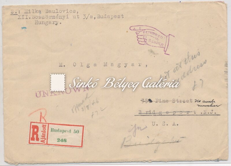 1946.01.31. 6. díjszabás ajánlott távolsági levél BUDAPEST-BRIDGEPORT