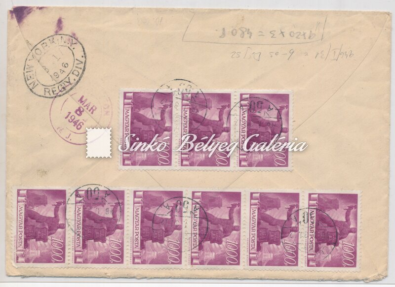 Leírás | 1946.01.31. 6. díjszabás ajánlott távolsági levél BUDAPEST-BRIDGEPORT, New Jersey USA között. Ismeretlen cím miatt visszaküldve. 1945. Újjáépítés sor 9x1000P bélyegével bérmentestíve. / 1946.01.31. 6. tariff registered long-distance letter between BUDAPEST-BRIDGEPORT, New Jersey USA. Returned to sender because of unknown address. Franked with 9x1000P stamps of the 1945. Reconstruction set. |