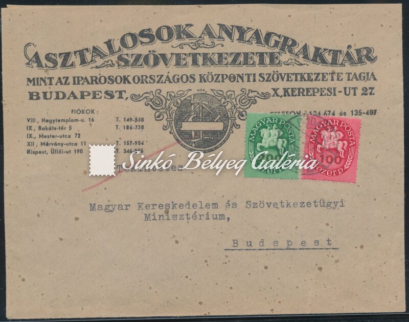 Leírás | 1946.04.29. 13. díjszabású helyi levél BUDAPESTen. 2db Lovasfutár bélyeggel bérmentesítve. / 1946.04.29. 13. tariff local letter in BUDAPEST. Franked with 2 pieces of Riding courier stamps. |