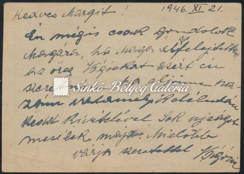 Leírás | 1946.11.21. Helyi tábori postai levelezőlap BUDAPESTen, polgári felhasználásban egyes bérmentesítés 20f díjtétellel. / 1946.11.21. Local field post postcard in BUDAPEST, in civilian use, franked with 20f fare. |