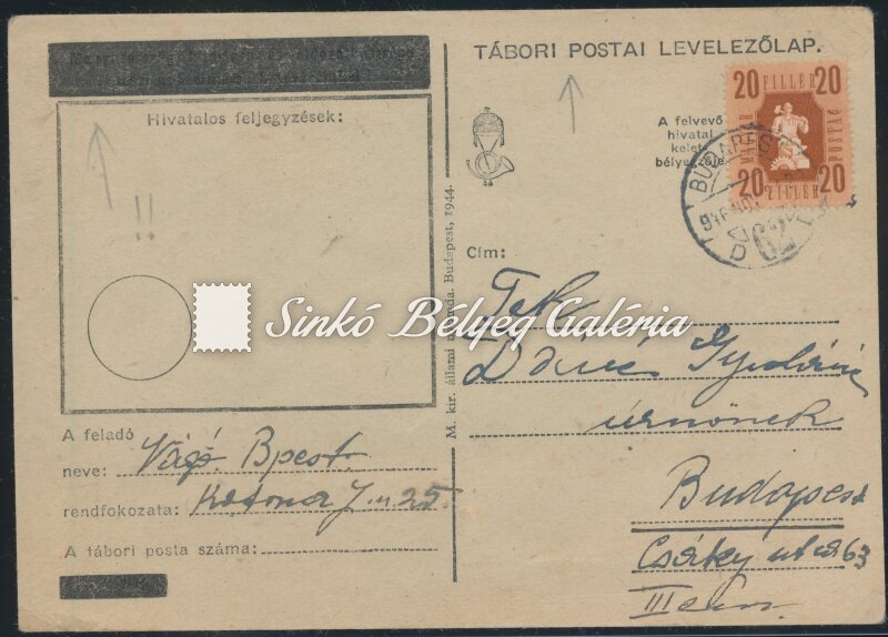 1946.11.21. Helyi tábori postai levelezőlap BUDAPEST