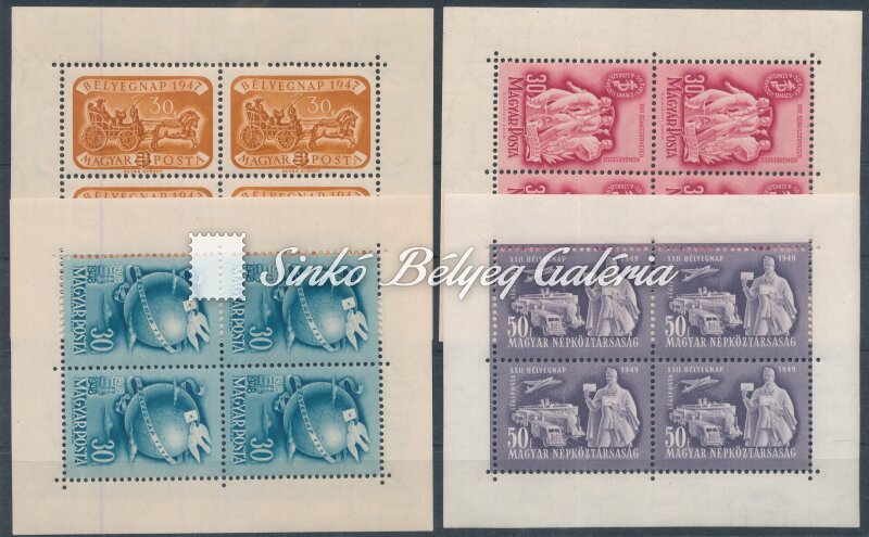 Leírás | 1947/49. Bélyegnapi és Szakszervezeti kisívek. 4db Katalógus érték: 33.000 HUF / 1947/49. Stamp Day and Trade Union miniature sheets. 4 pieces Catalogue value: 33.000 HUF |