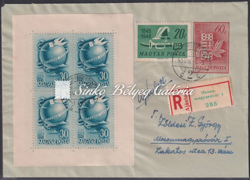 Leírás | 1948. Bélyegnap (21.) - kisív ajánlott levélen, 60f díjjegyes boríték 20f bélyegkiegészítéssel bérmentesítve! / 1948. Stamp Day (21.) - miniature sheet on a registered letter, 60f postal stationery envelope supplied and franked with a 20f stamp! |