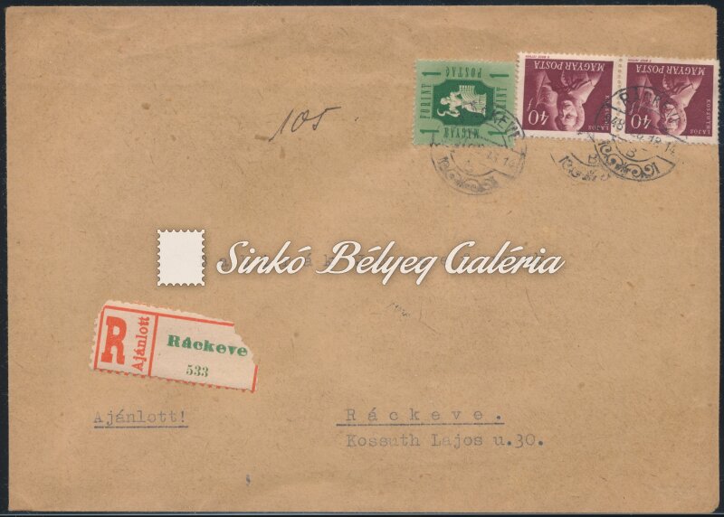 Description | 1948.02.18. Helyi ajánlott levél RÁCKEVÉN. Többes és vegyes bérmentesítéssel, 1,80Ft díjtétellel. / 1948.02.18. Local registered letter in RACKEVE. Multiple and mixed franking with 1,80Ft fare. |