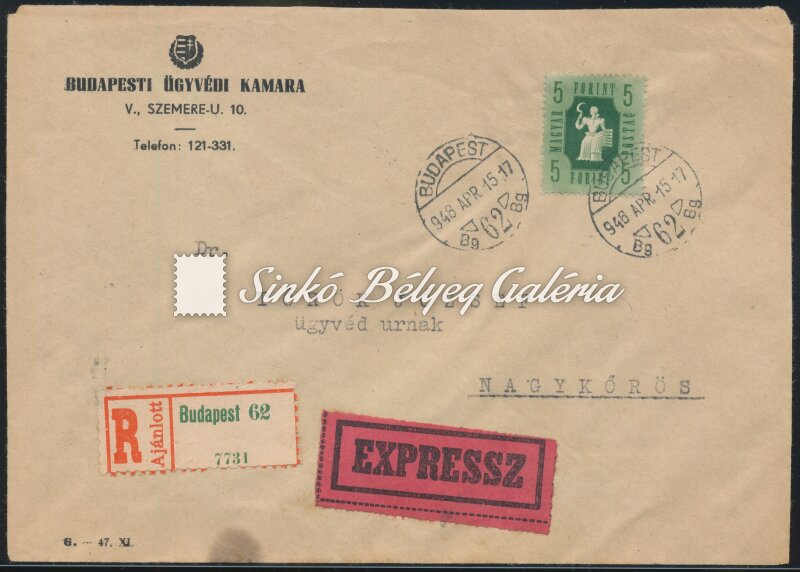 1948.04.15. Expressz ajánlott távolsági levél BUDAPEST-NAGYKŐRÖS