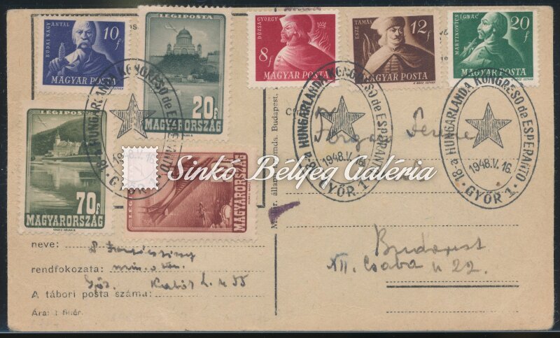 Description | 1948.05.16. Levelezőlap GYŐR-BUDAPEST között. Esperanto Kongresszus alkalmi bélyegzésével. 1,90Ft díjtétellel. Színes és vegyes bérmentesítéssel! / 1948.05.16. Postcard between GYŐR-BUDAPEST. With the occasional cancellation of the Esperanto Congress. With 1,90Ft fare. Colourful and mixed franking! |