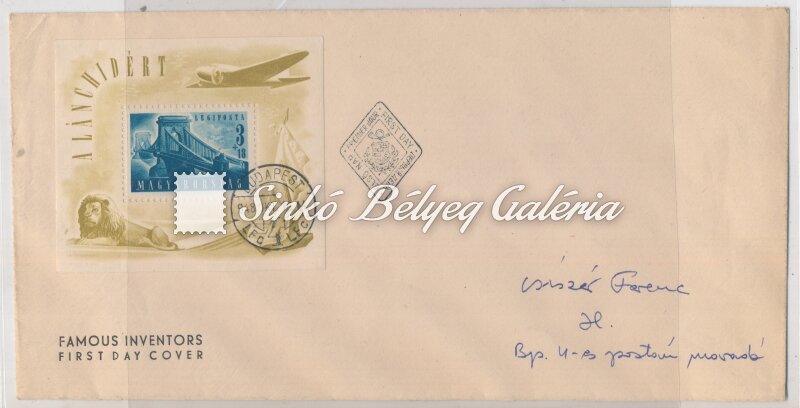 Leírás | 1948.10.16. Helyi levél BUDAPESTen, postán maradó levélként feladva. Lánchíd (II.) - Blokkal bérmentesítve. FDC / 1948.10.16. Local letter in BUDAPEST, sent as a letter to be left at the post office. Franked with Chain Bridge (II.) - Block FDC |
