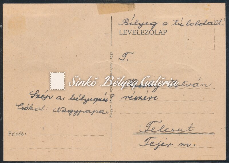 Leírás | 1948.12.18. Levelezőlap BUDAPEST-FELCSUT között. 1,40Ft viteldíjjal. Alkalmi bélyegzéssel! / 1948.12.18. Postcard between BUDAPEST-FELCSUT. With 1,40Ft fare. With occasional cancellation! |