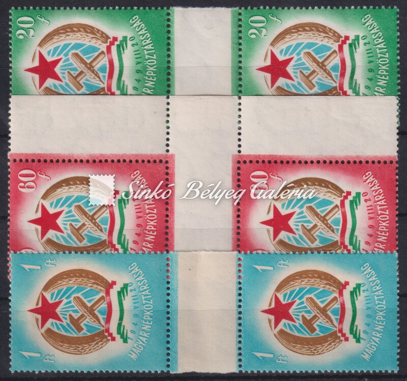 Leírás | 1949. Alkotmány (I.) Teljes sor ívközéprészes párban, XI. vízjeles papíron! / 1949. Constitution (I.) Complete set in pair with midsection, and on paper with XI. watermark! |