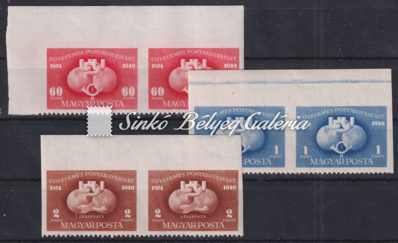 Leírás | 1949. UPU (I.) - L D sorozat párban, három oldalán fogazatlan, alul fogazott! / 1949. UPU (I.) - L D set in pair, imperforated on 3 sides, perforated below! |