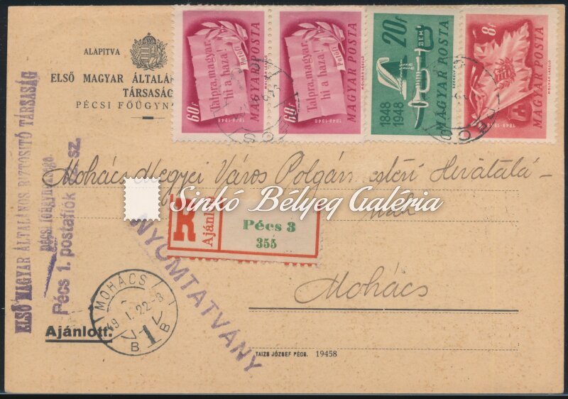 1949.01.22. Ajánlott levél PÉCS-MOHÁCS
