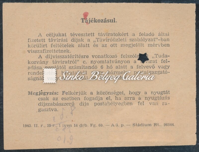 Leírás | 1949.05.03. Távirati díjnyugta GYŐR/1, 60f bélyeggel! Érvénytelenítő lyukasztással! / 1949.05.03. Telegraphic price receipt GYOR/1, with 60f stamp! With invalidating punch! |