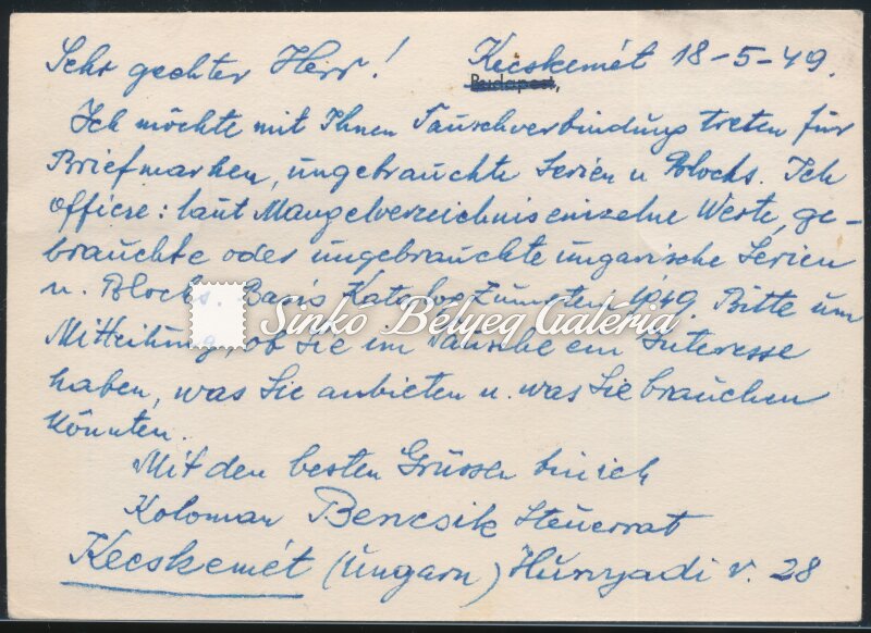 1949.05.08. Ajánlott levél KECSKEMÉT-PRATTELN