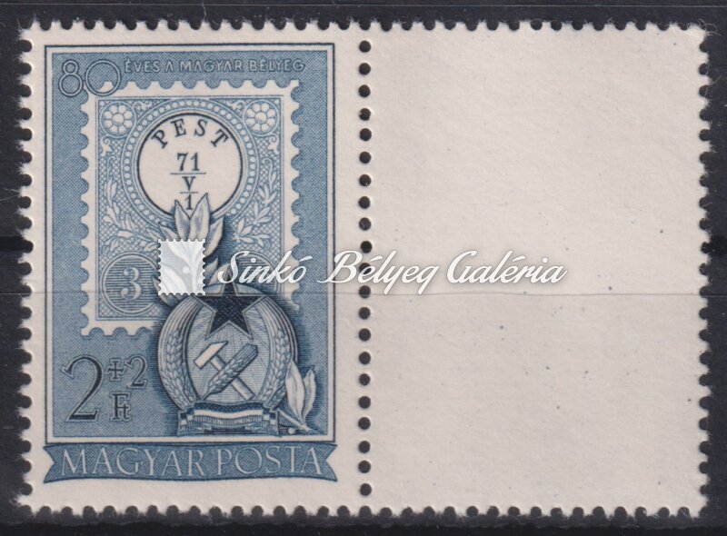 Leírás | 1951. Bélyegnap (24.) - 80 éves a Magyar Bélyeg 2(+2)Ft bélyeg jobb oldali üres mezővel. / 1951. Stamp Day (24.) - The Hungarian Stamp is 80 years old 2(+2)Ft stamp with blank field on the right side. |