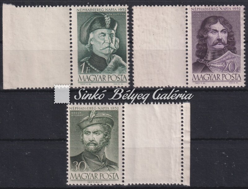 Description | 1952. A Néphadsereg Napja (II.) 20f, 30f, 1Ft bélyegek jobb és bal oldali üres mezővel. / 1952. Day of the People's Army (II.) 20f, 30f, 1Ft stamps with blank fields on the right and left side. |