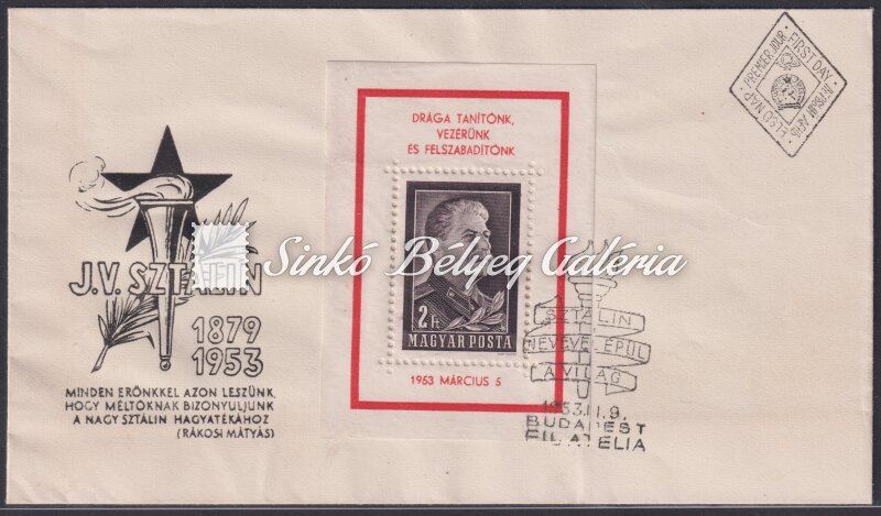 Description | 1953. Sztálin-Gyászblokk Gépi sajtós, FDC-n! / 1953. Stalin-Mourning block Machine pressed, on FDC! |