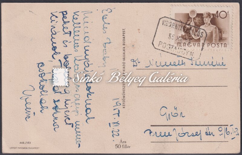 Description | 1955.12.23. Képeslap VIDORNYASZŐLLŐS POSTA ÜGYN. bélyegzéssel! 40f viteldíjjal! / 1955.12.23. Postcard with VIDORNYASZOLLOS POSTAL AGENCY cancellation! With 40f fare! |