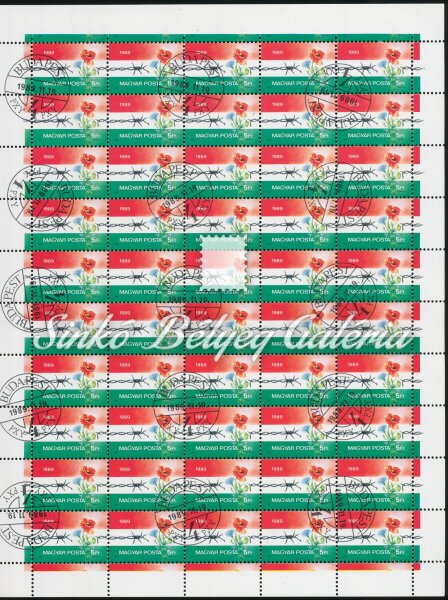 Leírás | 1989. Lebontott Vasfüggöny Hajtott teljes ív. (50 bélyeg) / 1989. Demolished Iron Curtain Folded full sheet. (50 stamps) |